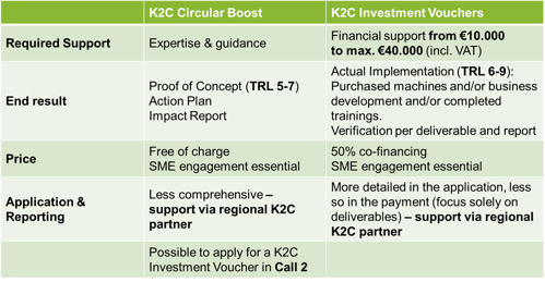 K2C Investment Vouchers zijn geschikter als u klaar bent voor daadwerkelijke implementatie, zoals de aanschaf van machines of training (TRL 6–9), met financiële ondersteuning van € 10.000 tot € 40.000 (incl. btw). Externe expertise en opleiding zijn niet standaard inbegrepen, maar kunnen indien nodig deel uitmaken van het implementatieplan voor de voucher.